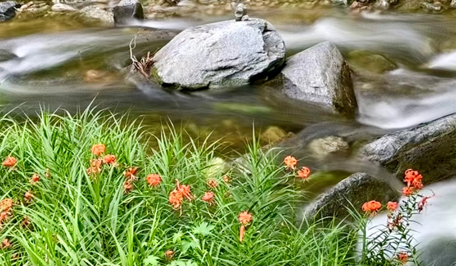 “碧峰寺”不远了,印象中那里有许多的虎皮百合。听到队长的召唤,期待着能尽快看见更多的虎皮百合,大家迅速回归栈道,疾步前行。可眼前的景色实在太美了,怎忍离去。纠结中,我不停地拍摄着河中的溪流、美石、碧草,不知不觉中又落在了队伍的最后。