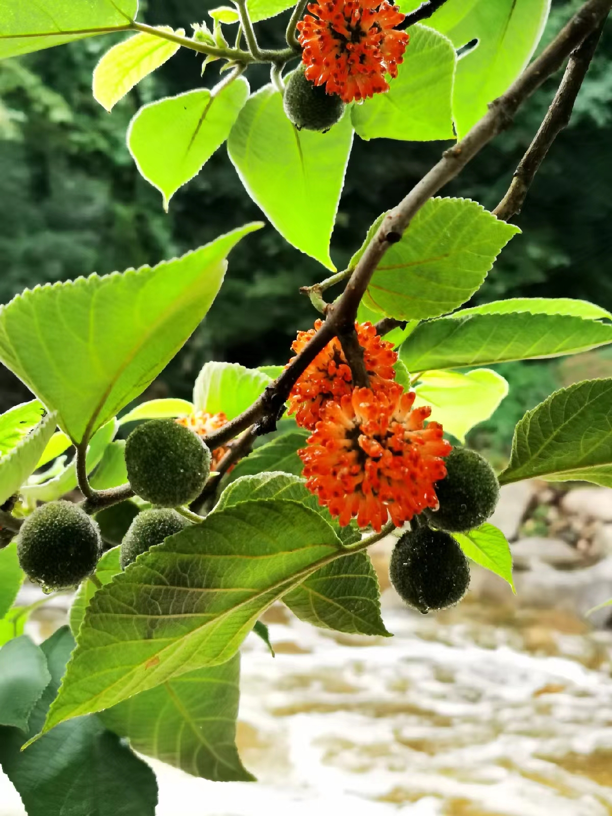 刚走几步,河边几棵挂满红红球状果实的构树,引起了大家兴趣。这构树,也称楮树,《酉阳杂俎》载:“叶有瓣日楮,即叶之缺刻,叶有无缺刻是单株间的变异,今均称为构树。”构树古代又称为“榖”,汉代《说文解字》中有“榖,楮也”的说法。《诗经·小雅》的鹤鸣篇有“乐彼之园,爰有树檀,其下维榖”;黄鸟篇亦有“黄鸟黄鸟,无集于榖,无啄我粟”的诗句。构树全身都是宝,其果、子、叶等皆可入药,树皮更是造纸的好材料。这树在农村几乎遍地皆是,不知从何时起,农民却对它越来越不待见了,一看见,不是挥舞镰刀,就是举起镢头,而我,儿时对它却是十分偏爱的。那时每天放学后,都要上山打猪草,贪玩的我,到该回家的时候,装猪草的筐子几乎还是空的。怕回家挨训,只好拿起镰刀,嘁哩喀喳砍上一筐构树叶完事。这事多年后,还被姐姐妹妹们拿来取笑于我。