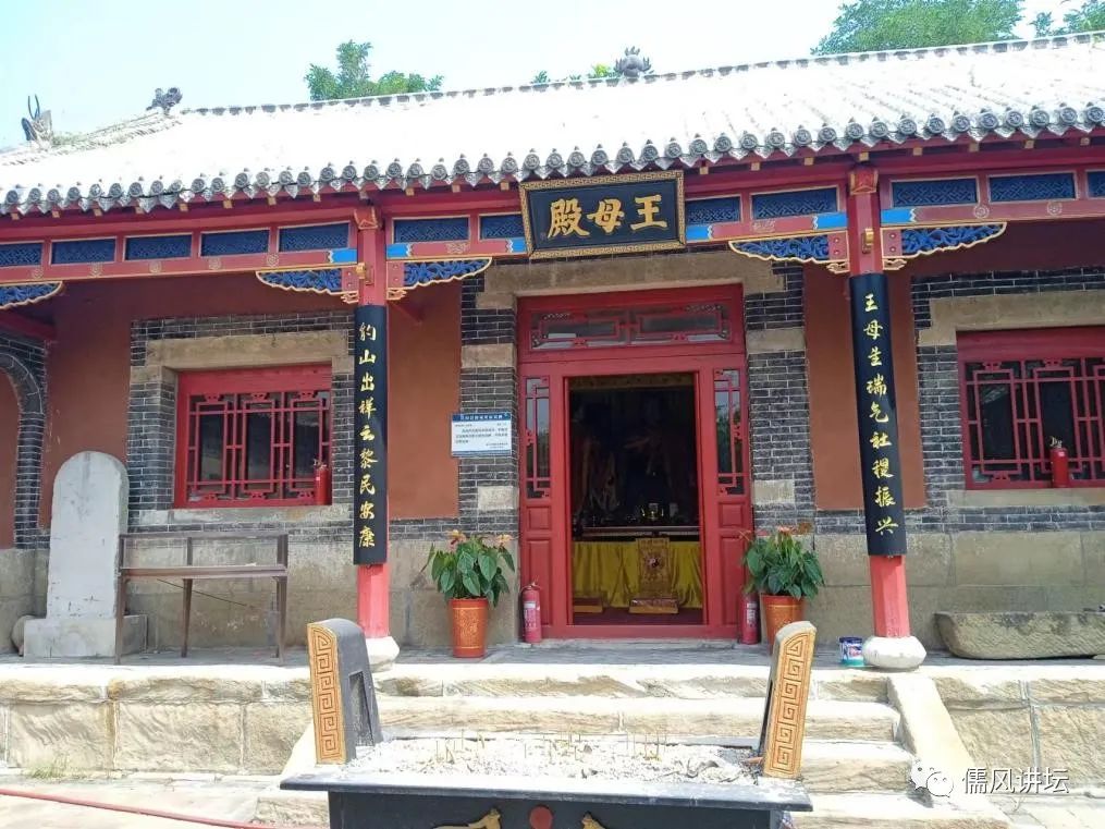 进入西门,迎面是一幅阴阳太极图,太极图是道教的一个重要标志;两旁对联是:日月乾坤定, 阴阳顺自然。这幅太极图绘在王母殿的西山墙上,王母殿坐北朝南,始建于明万历年间,距今已经有500年历史。