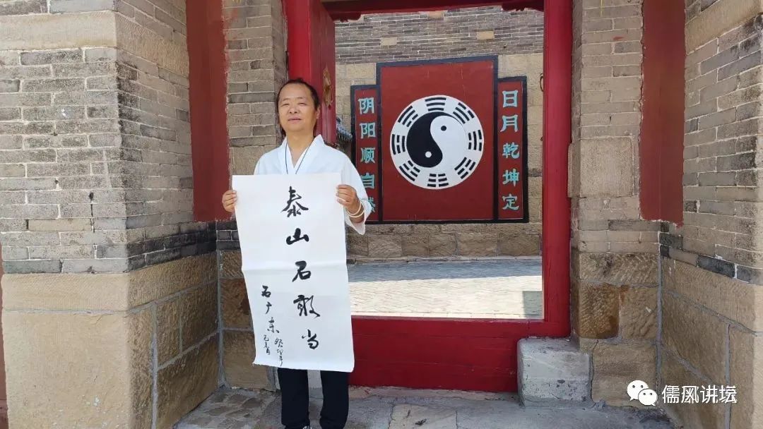 茶毕临别,道长邀请诸位留下墨宝,邵老师等就力荐由我题字;而从未题过字的我,遂勉为其难,献丑留拙:“泰山石敢当”。