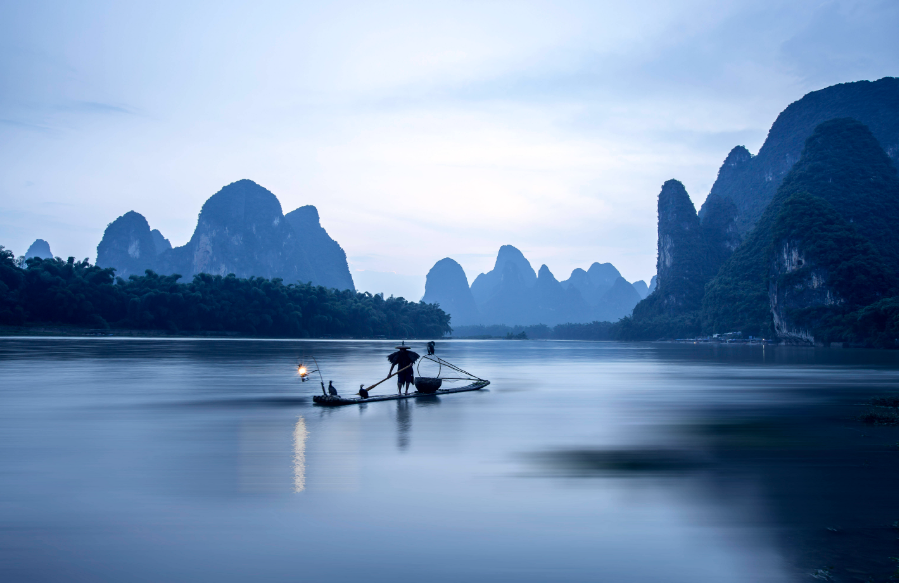 青山楚楚水徘徊,竹筏悠悠载客来。