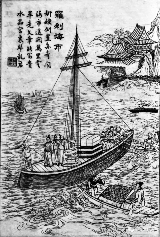 不久,果然有人上门来送钱托购珍宝的,马骥与村民们把钱装上船。大船能容好几十人,平底高栏,由十个人摇橹,行走得像箭一般,激起层层水花。走了三天,远远望见云天相接、水波荡漾之间,出现了重重叠叠的巍峨楼阁,四方赶来做生意的船只,多得如蚂蚁一般。不一会,船来到了城下,仰视城墙上的砖块,都与人一样高,敌楼高耸云霄。系好船只登岸入城,只见海市上所陈列的奇珍异宝,晶莹耀眼,大多是世人从未见过的。忽然,一位少年骑着蛟马驰来,市上的人纷纷奔走躲避,说是东洋三世子来了。世子走过来,看着马骥说:“这不是外邦人。”说着就有一名为世子开道的人来问马骥的乡籍。马骥站在路旁施礼,叙说了自己的家世出身。世子听了高兴地说:‘既蒙你光临敝地,我真是缘分不浅。”于是命人牵来坐骑给马骥,又请求与他并马而行。出了西城,刚到海岛岸边,那匹坐骑就嘶叫着跳进水中。马骥大惊,失声呼叫起来,却见海水向两边分开,犹如两堵高墙屹立着。走下去不多远,马骥就看见了宫殿,以玳瑁装饰屋梁,以鲂鱼鳞片作瓦,四壁透明,光可鉴人,亮得耀眼。