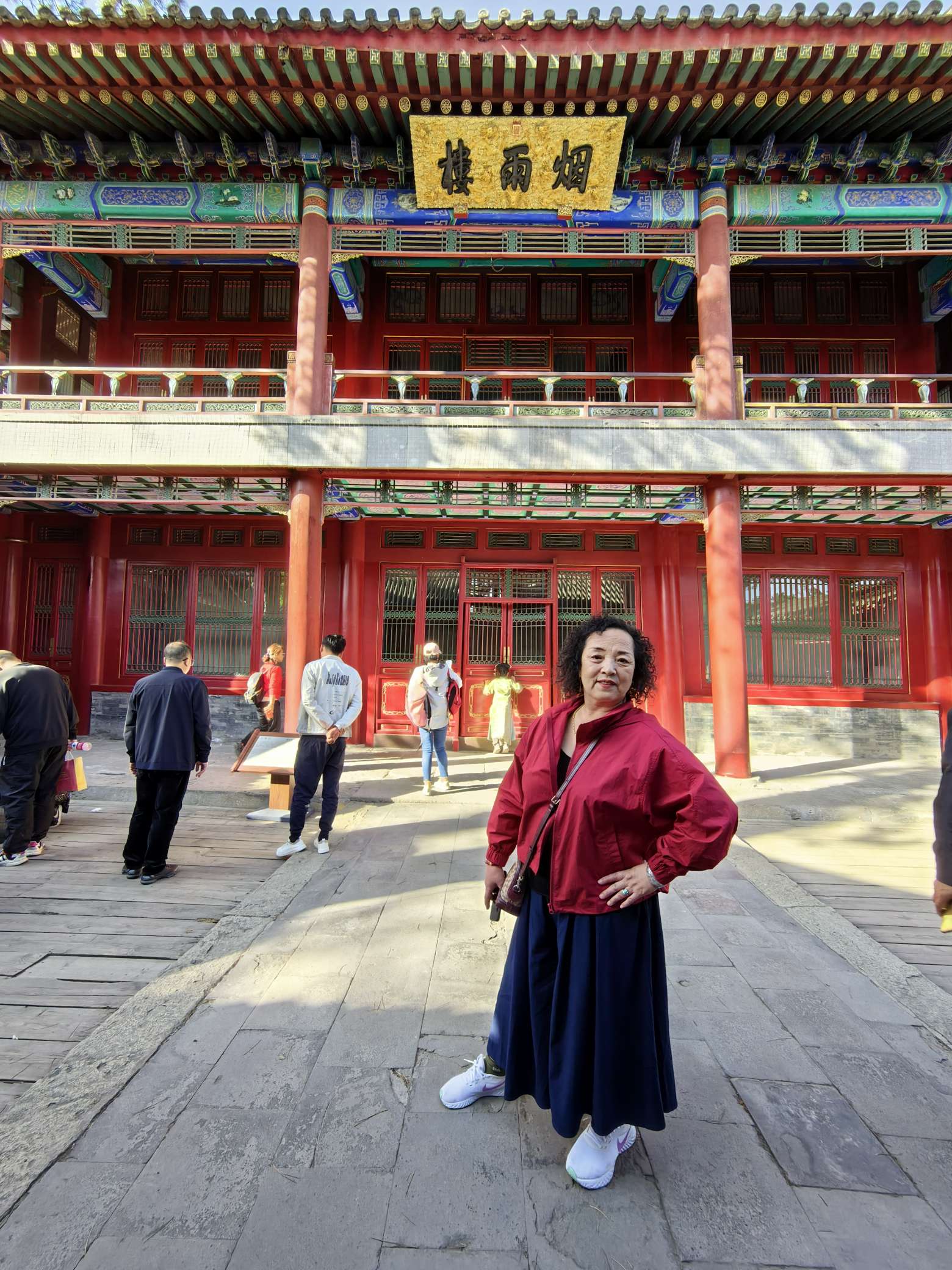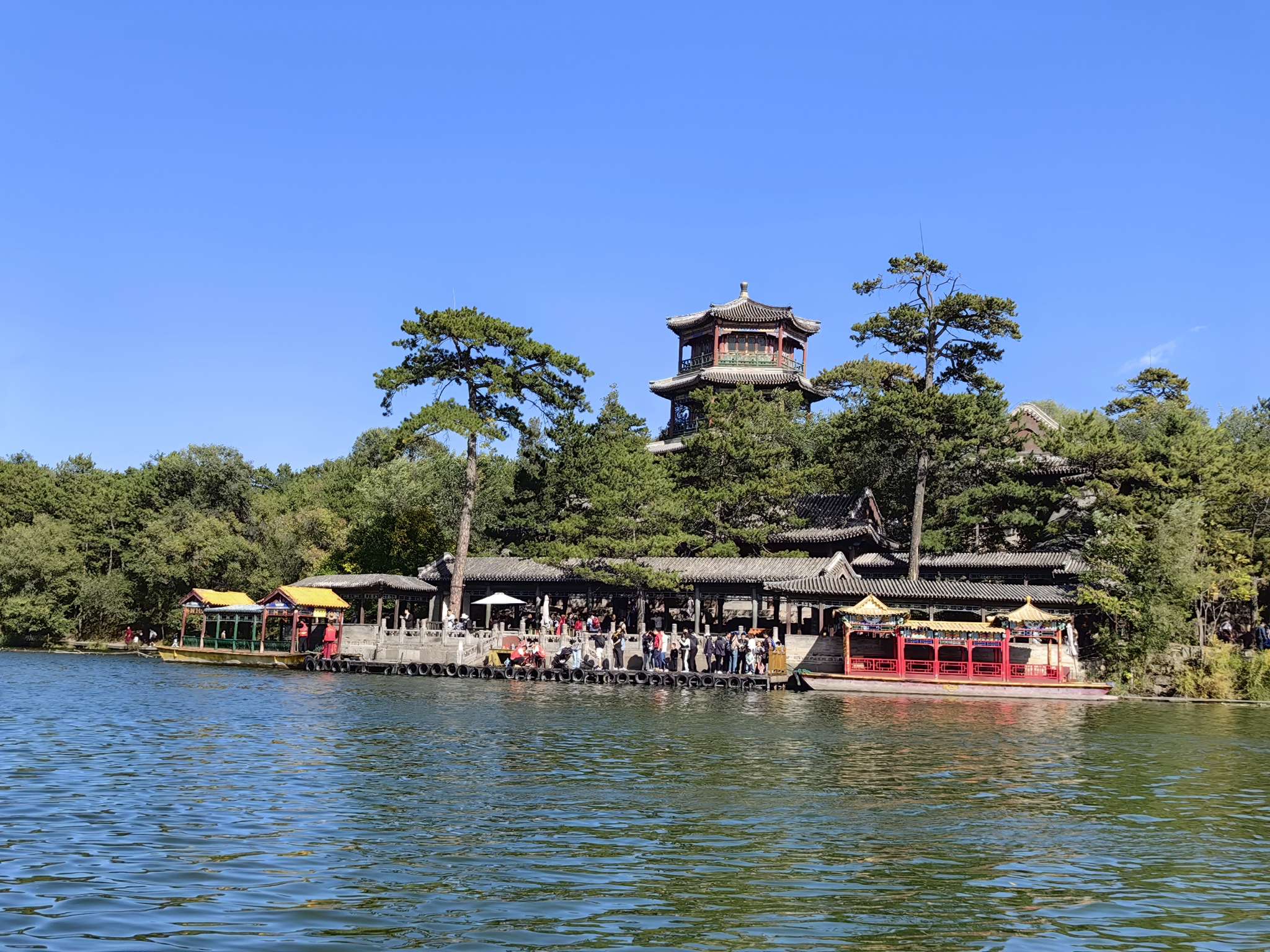 游览完金山上帝阁,又坐船去烟雨楼,烟雨楼建于乾隆四十五年(1780),坐落于避暑山庄青莲岛上。乾隆南巡时,见浙江嘉兴南湖鸳鸯岛上的烟雨楼晨烟暮雨,非奇妙,就命画师临摹,并在青莲岛上仿建。此楼面阔五间,上下两层,四面皆辟窗,正面檐下悬挂乾隆帝御题云龙金匾“烟南楼“,联为:“百尺起空蒙,碧涵莲岛;八窗临渺澜,澄印鸳湖“。二楼四周有栏杆,可凭栏环览四周景色。月台下两处石雕弥座上有根据古代“河图洛书“制造的铜质海马一对。烟雨楼东侧跨院有“青杨书屋“,其南北各有亭。西侧有“对山斋”。