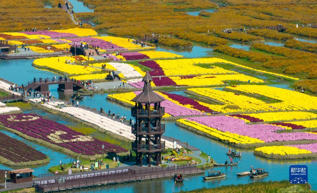 10月21日,游客在江苏省兴化市千垛景区赏菊游玩(无人机照片)。新华社发(周社根 摄)