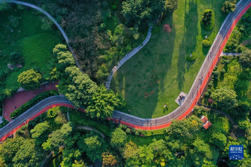 10月21日,市民和游客在重庆渝北龙头寺公园运动、游玩(无人机照片)。新华社记者王全超 摄
