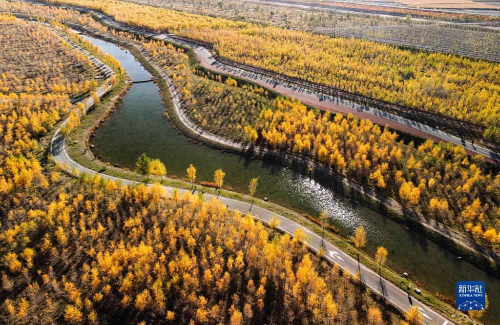 10月21日在甘肃省张掖市甘州区奥林匹克森林公园拍摄的金色的胡杨林(无人机照片)。新华社发(陈礼 摄)