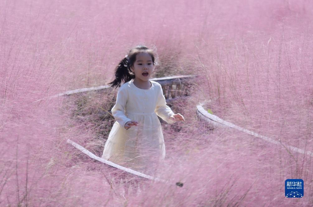 10月21日,一名小朋友在江苏常州光伏产业公园粉黛乱子草丛间游玩。新华社发(王启明 摄)