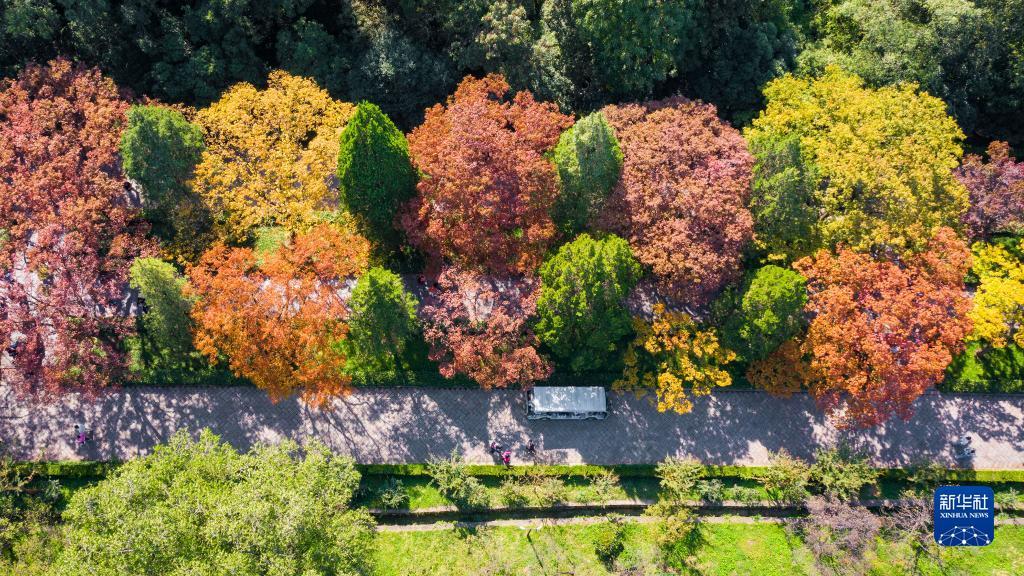 10月21日拍摄的南京明孝陵景区石象路秋景(无人机照片)。新华社发(苏阳 摄)