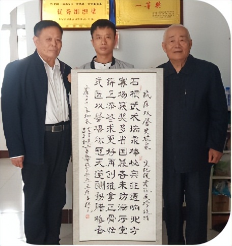 王庆吉(右一)孔庆珍(左一)向史瑞泉赠送书法作品