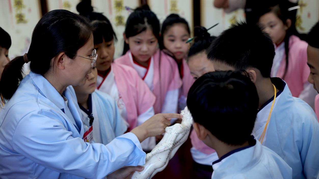 学生在中医师的引领下,走进中医文化馆,在“扁鹊医馆”“守真草堂”“寿甫书阁”内,学习了解扁鹊、刘守真、张锡纯等中医名家的传奇故事和中医药文化的发展传承历史。在百草厅,中医师展示白芷、山药等常见中药材,让学生通过闻、尝、观等方式,了解不同种类药材的功效。学生还手工制作中药香囊、了解人体重要穴位、学习如何诊脉,进一步感受中医药文化的魅力。