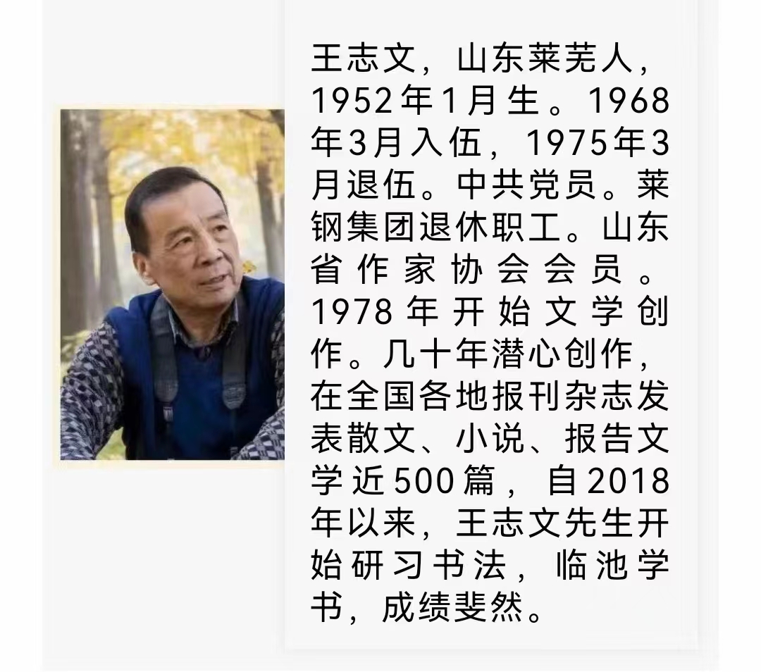 不管怎么说,反正从认知文学的王志文老师,到感悟书法的王志文老师,在我的心目中,就像展翅高飞的雄鹰一样,因为同时展开了文学和书法这两只有力的翅膀,身高并不优于我的王老师,瞬间在我的眼前高大起来,甚至需要仰视才能见其脸面。我想,我必须得动手写点文字留作纪念了,否则我就真得对不起每次组织活动都邀我参加的我的王老师了。