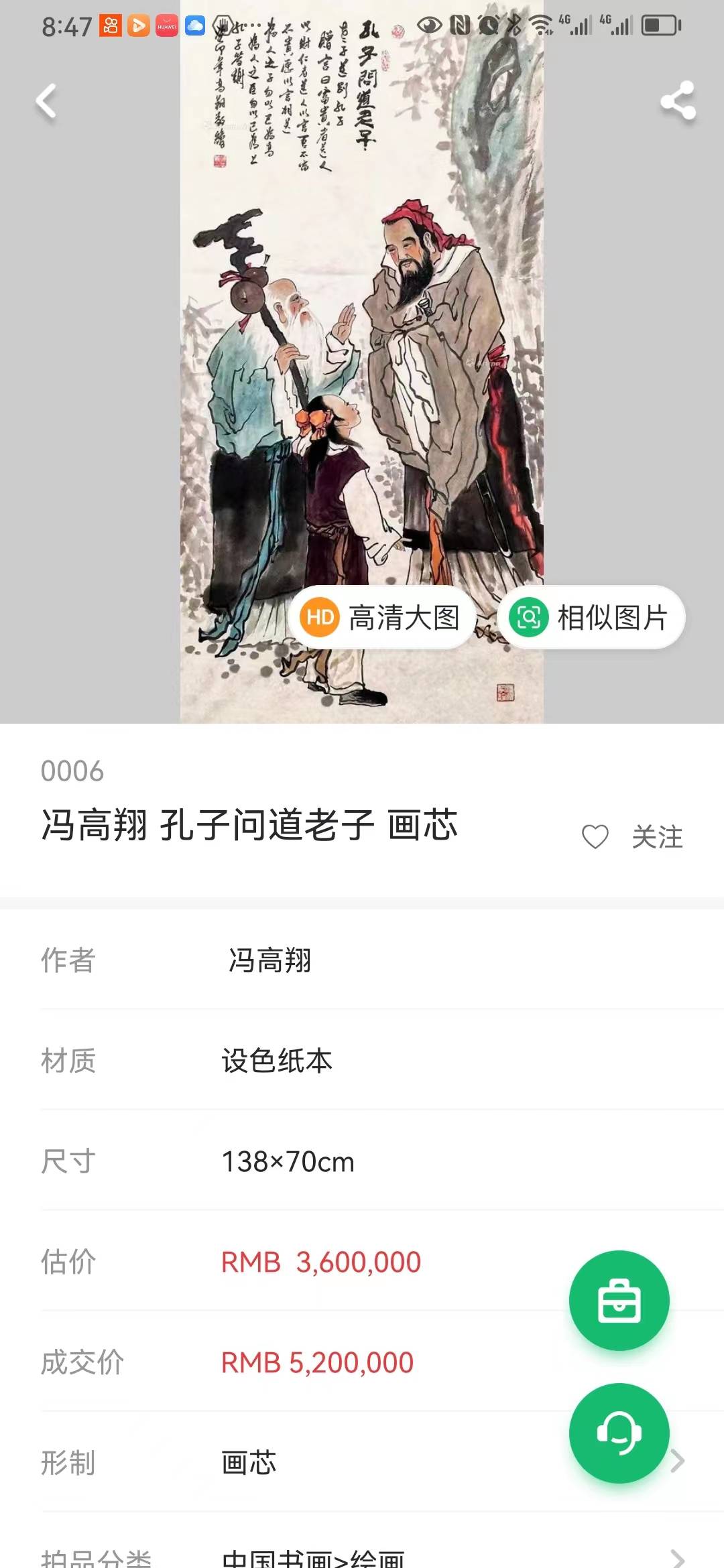 2023年11月11日大红袍艺术家冯高翔作品《孔子问道老子》尺寸138x70cm,由北京传世水墨拍卖有限公司在金秋盛世专场拍卖会拍卖,以伍佰贰拾万元(5200000元)落槌成交!