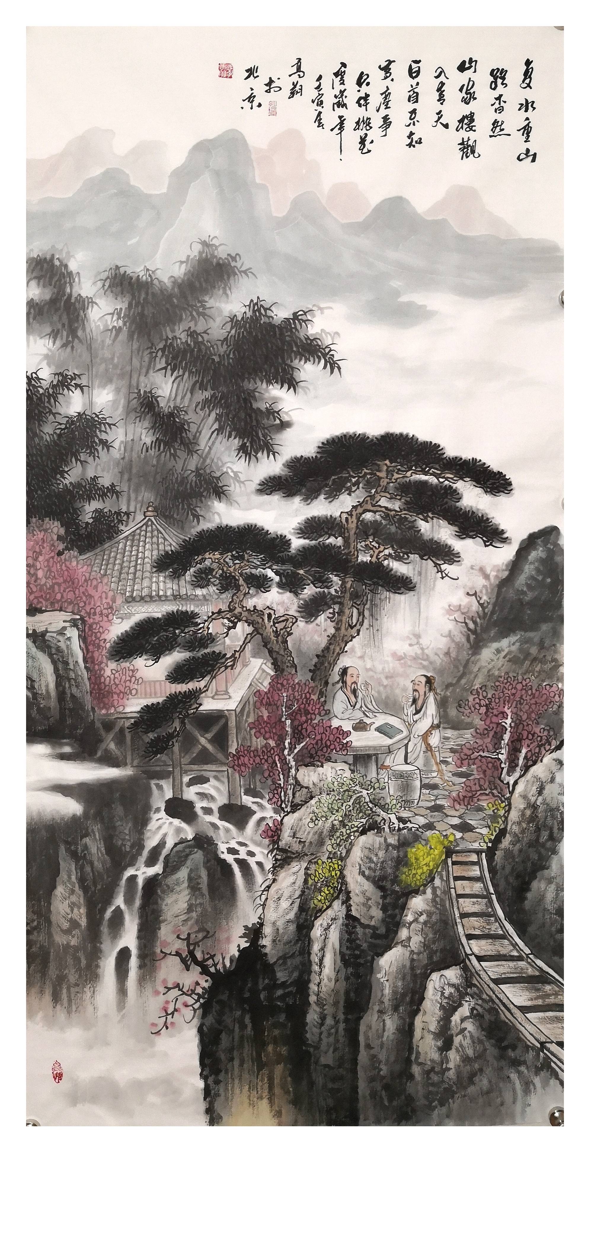 冯高翔,字云鹤,一九六七年生于河南省焦作市,毕业于河大美术系。参加过中国美术家协会河南省分会主办的“中国画高级研讨班”。在当地博物馆任职,长期从事国画、山水、人物、花鸟和大型国画创作并出版大红袍,2022年春拍《听泉品茗图》以七十四万七千五百元落槌。