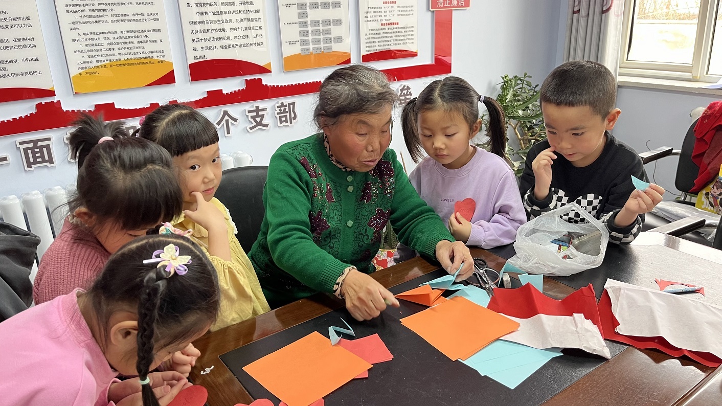 闫秀兰耐心教小朋友折剪的过程和步骤。