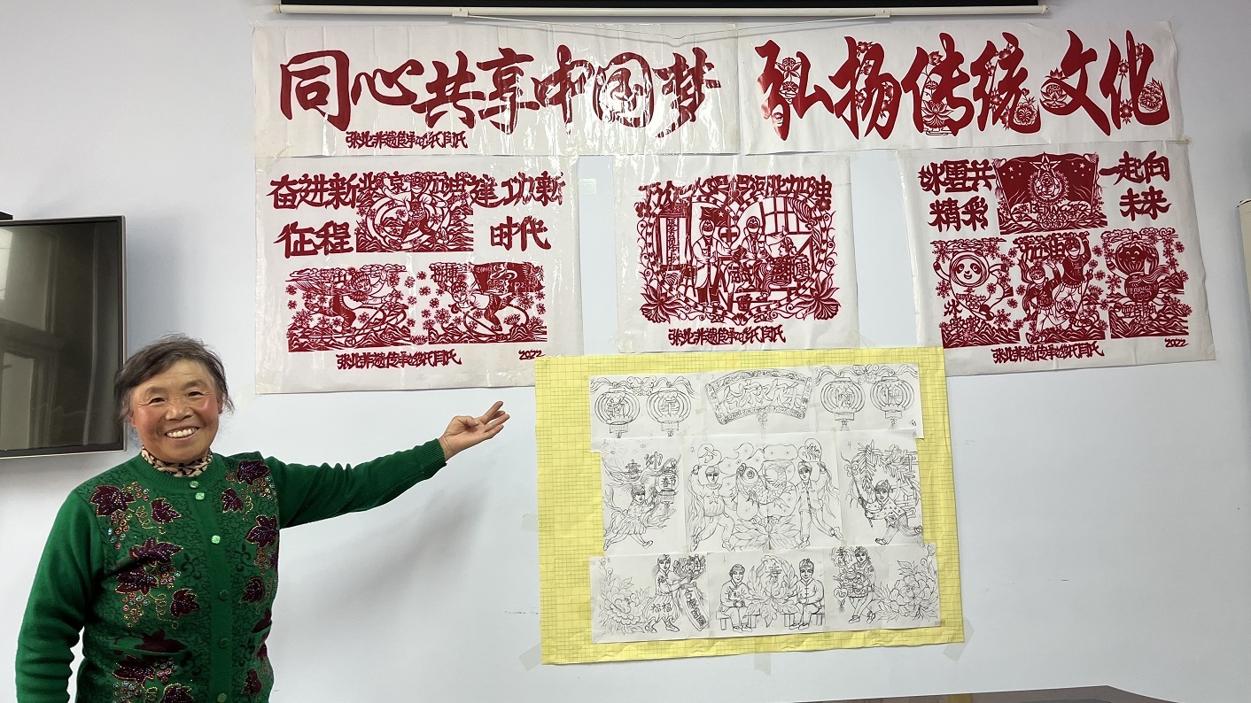 闫秀兰讲解剪纸的要领和技巧。