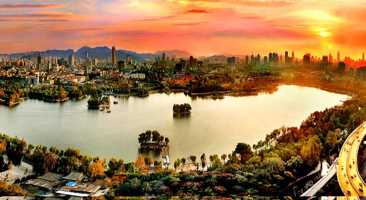 承泰岳之余脉,化群山连绵之俊秀。千佛山中坐垂景,云径禅关,清妙宁静,余佑千年。登临而上,览望齐烟九点,或丹崖如仞,或巍峨缥缈,或隆崛青云,遥相呼应,各得所趣,远眺南山群脉,青壁万重,翠若屏风,云霓广衍,络绎缭绕,绘尽宇宙虚实之道。济南为群山环抱,终日和畅如笑,或乾坤朗朗,或暮霭沉沉,皆安然如磐,空灵若婴。凌虚迥眺,情舒放而固志,仰观俯察,心慷慨以忘忧。