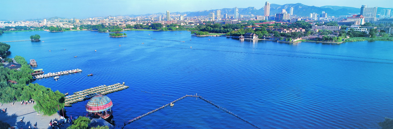 寄明湖之疏阔,生燕处超然之清姿。大明湖居于城中,为泉水汇聚而成,清流源远,丰丽博敞,穿花拂柳,鸢飞鱼跃,清福万善,莫不毕集。赏山泽之饶,享舟车之美,醉月夜之盛,如游画中,如行诗里,如居梦境。湖心岛具关雎之洁,超然楼似荣观燕处,汇波楼将景以赋显,铁公祠使忠以颂宣,南丰祠有雅音悦耳,稼轩祠得徽文溢目,七桥风月,八景交辉,亭台轩榭,华阙朱堂,文德相融,善以示后。大明湖如清尊沉酿、圭璧金璋,令万居涵泳,使德泽广布。