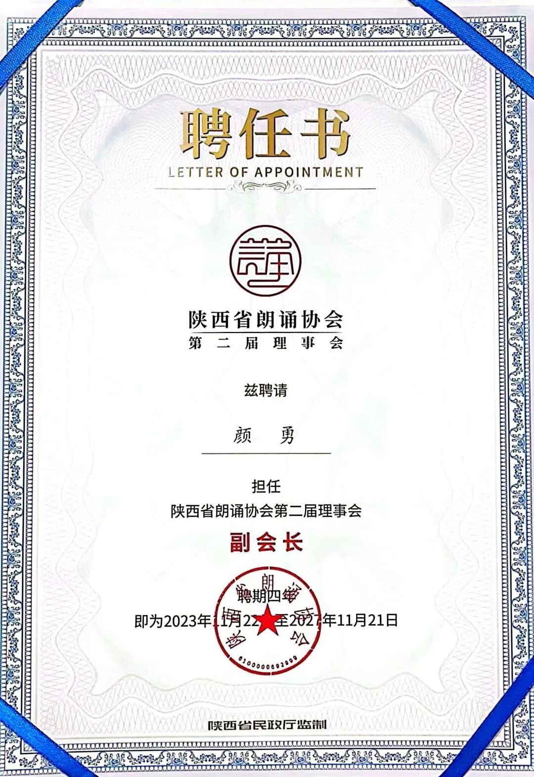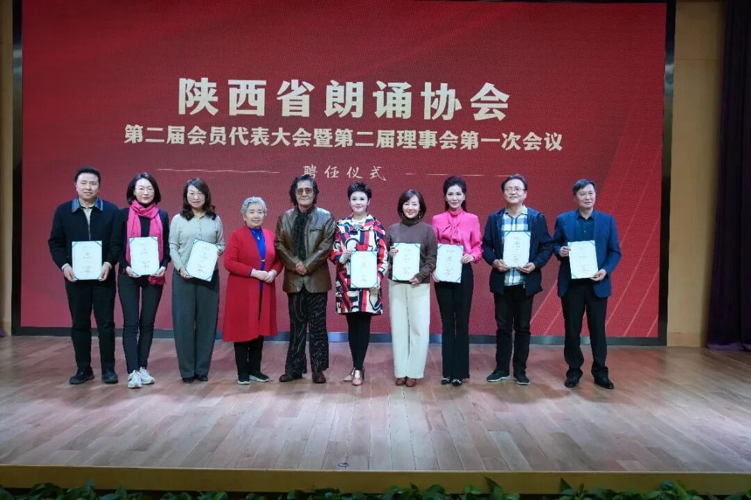 经第二届理事会讨论一致通过,聘请林凯、许还山、海茵、刘远、陈爱美、吴京安担任陕西省朗诵协会名誉会长,现场为第二届当选的常务副会长、副会长、秘书长及理事会成员颁发了聘书。
