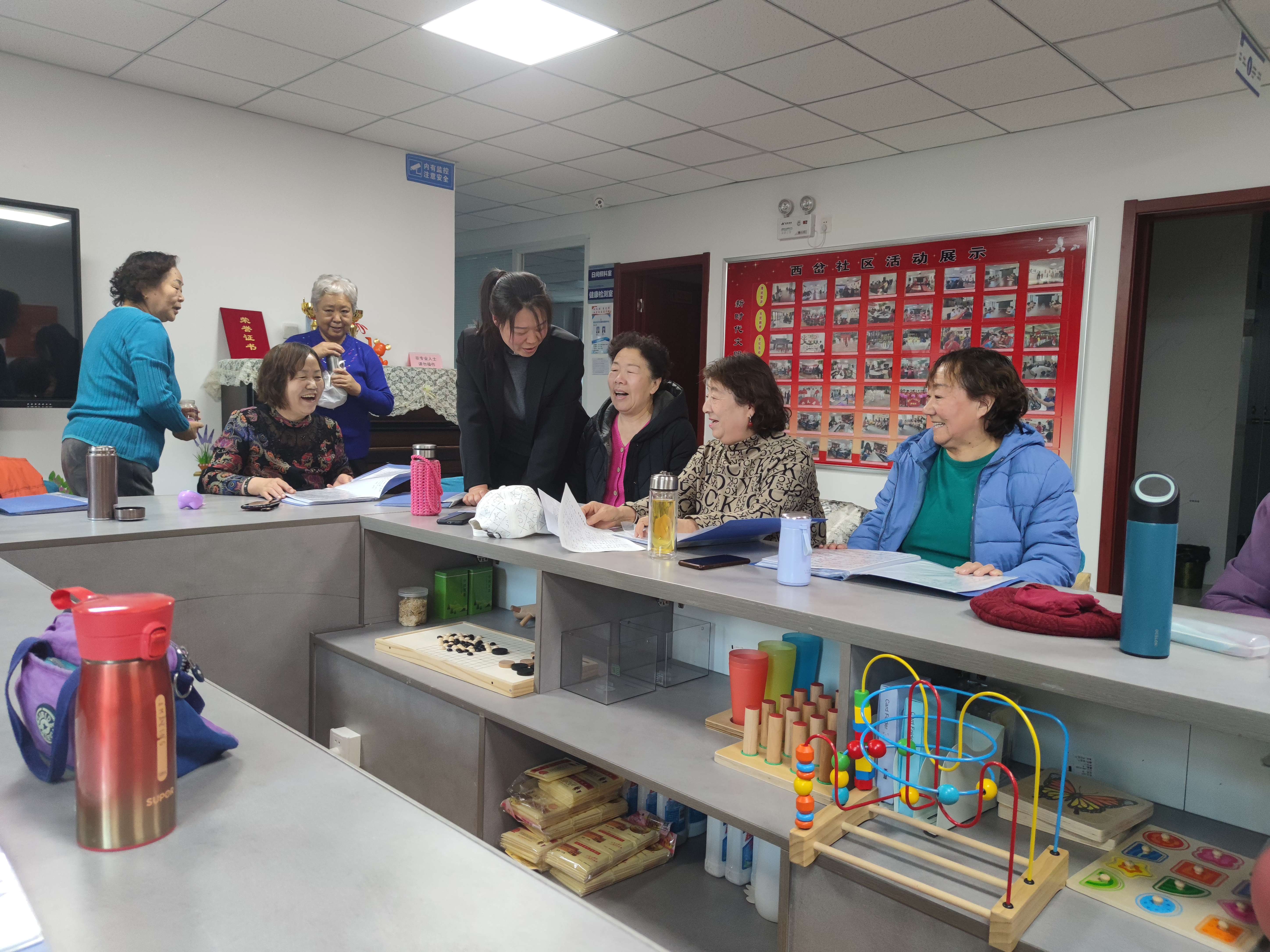 李明秀在桥西区西岔社区日间照料服务中心陪老人们玩牌。