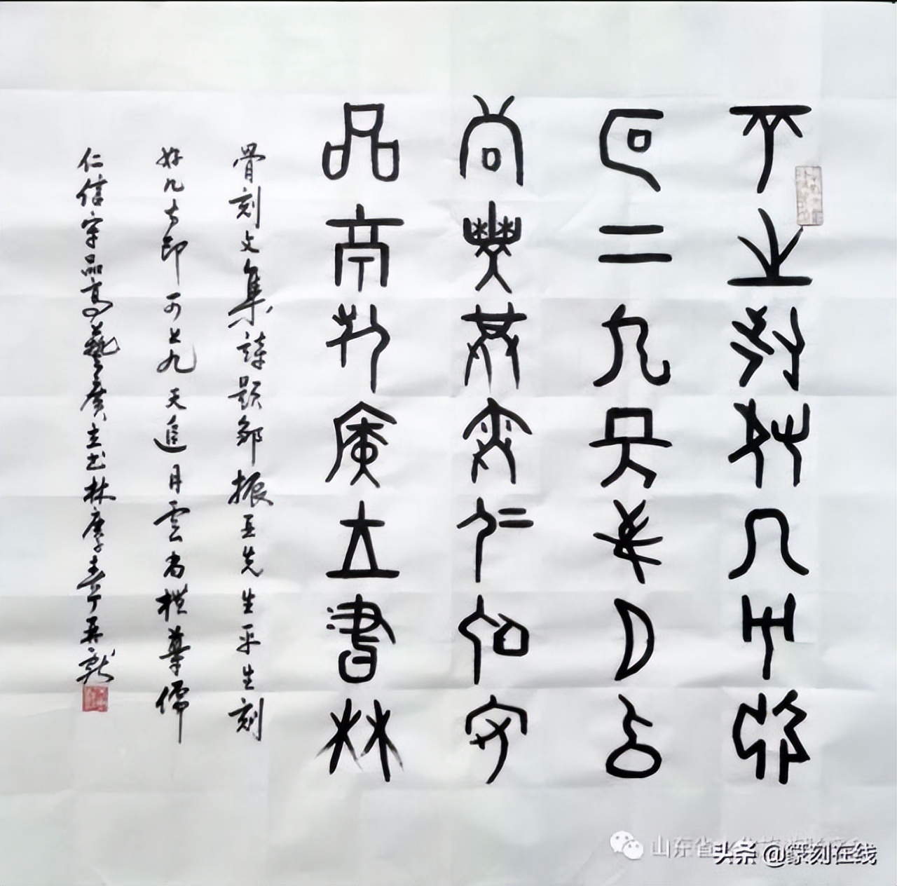 方寸之间透露着先生的高雅品质,小小一方印章寄托了邹公对后生的期望。邹振亚先生的文品和人品,一直影响了我,成为我以后工作、学习和书法艺术的标杆。特别是后期的东夷文化研究、骨刻文字的破译、骨刻文书法艺术的初创、传承发展增添了巨大的决心和动力。今天,我以东夷骨刻文字集绝句一首,作为本文结束语,诗曰: