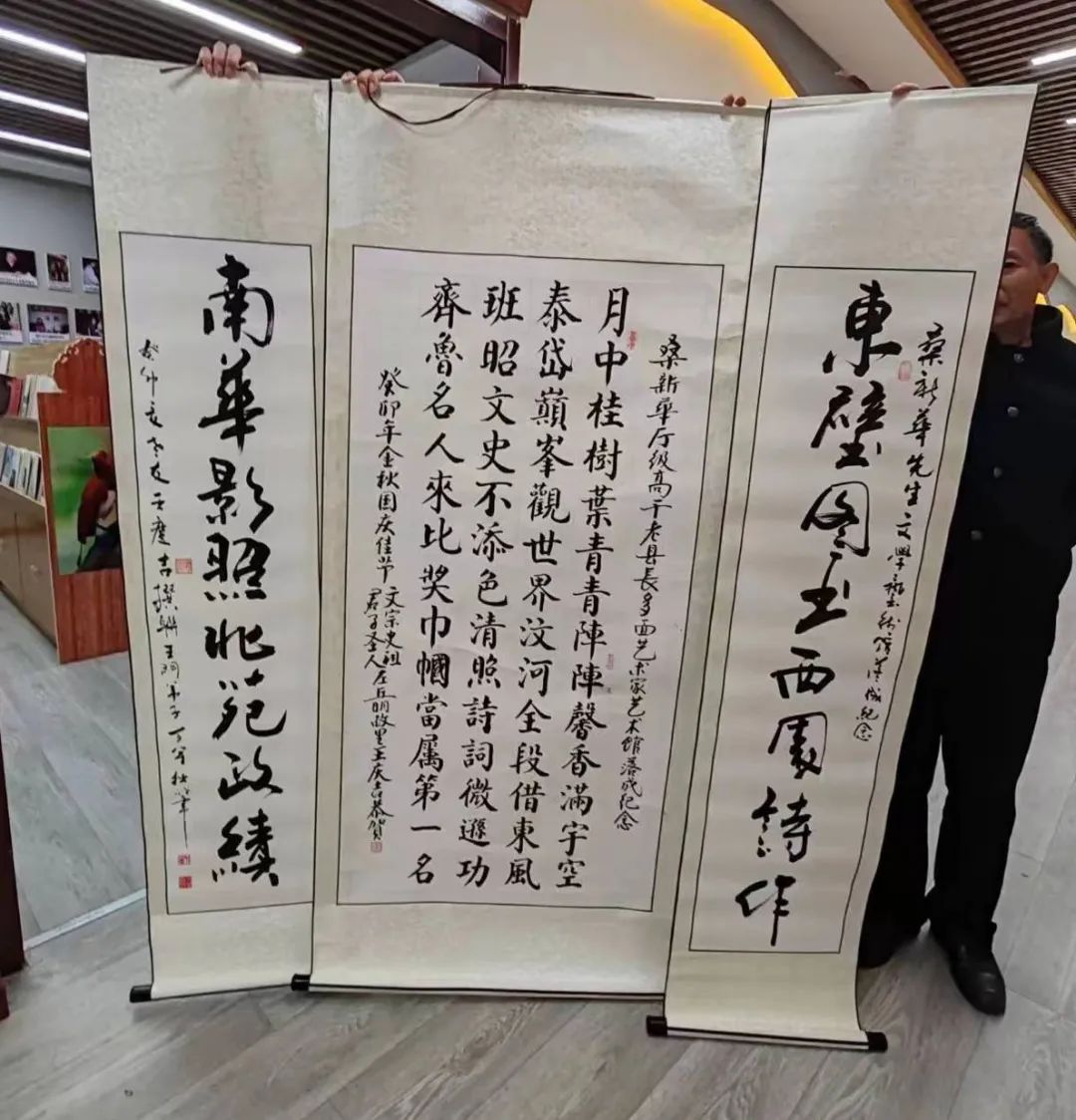 回到办公大楼,王书记立即展开我赠的书法作品,和王书记共同合影留念。