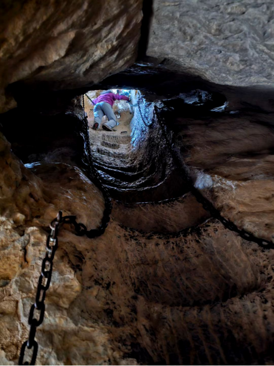 大家沿着台阶往峪内下行,去探王母洞。石阶甚陡,但有铁栏杆和铁链,给人增加了几分安全感。大家辗转上下数百级石阶,经过三清洞、玉皇殿、王母泉后抵达王母洞。