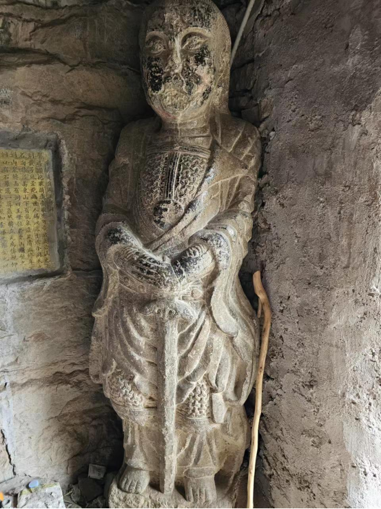 洞内墙角站立一武士俑,高1.7米左右,真人大小,身披盔甲,双手按剑,赤足而立。至于是什么时期的作品,不得而知。更令人不能理解的是,武士俑为什么不穿鞋呢?
