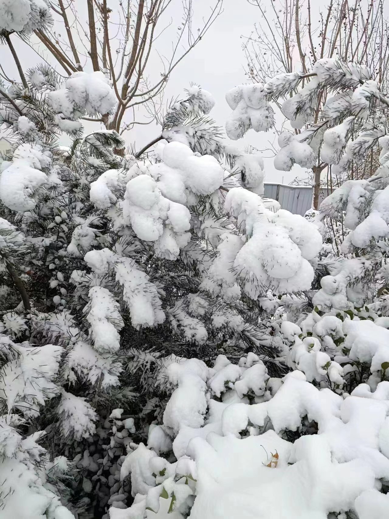 晨见窗前琼絮飞,车灯照辉舞银辉。绿茵丛顶披白巾,红瓦楼端着靓盔。