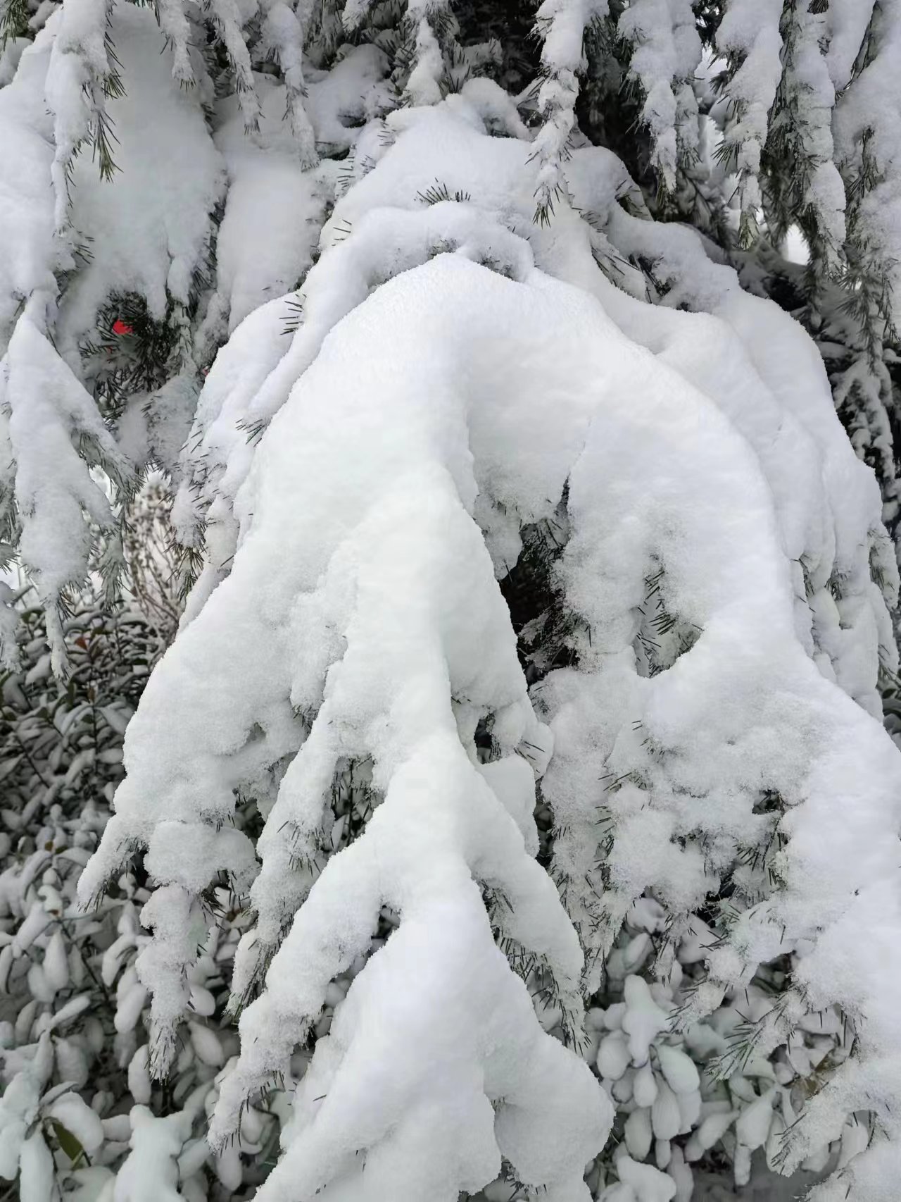 晨早雪花飘,枝条下压腰。