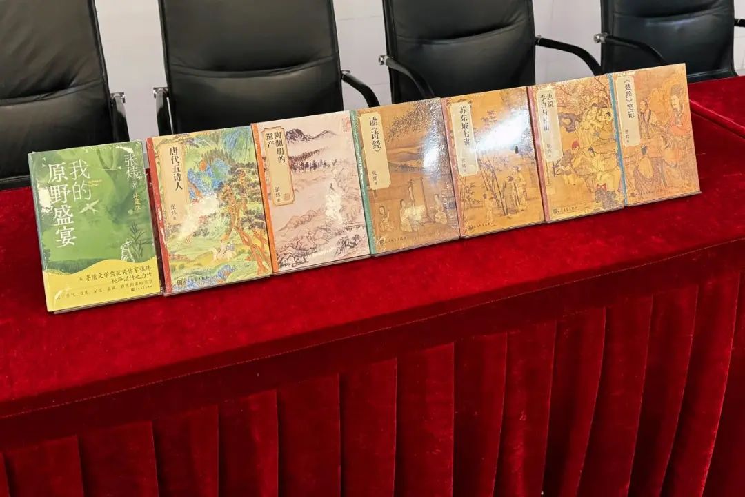 张炜老师不仅在学术上建树良多,更积极关心青少年的阅读和成长。今天特地带来了他的七本新书《陶渊明的遗产》《苏东坡七讲》《唐代五诗人》《楚辞笔记》《读诗经》《也说李白和杜甫》《我的原野盛宴》赠与学校图书馆,丰富学校馆藏,为同学们提供更多的学习资源。主持人张春梅老师代表学校对张炜老师表示感谢。