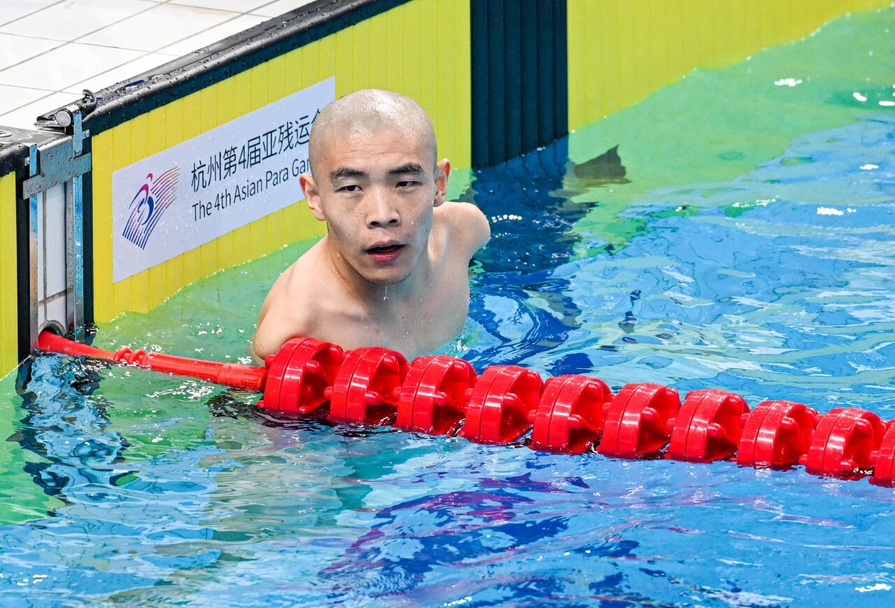 10月23日,郭金城在杭州亚残运会S5级男子50米自由泳比赛后看成绩。河北日报记者 耿辉 摄