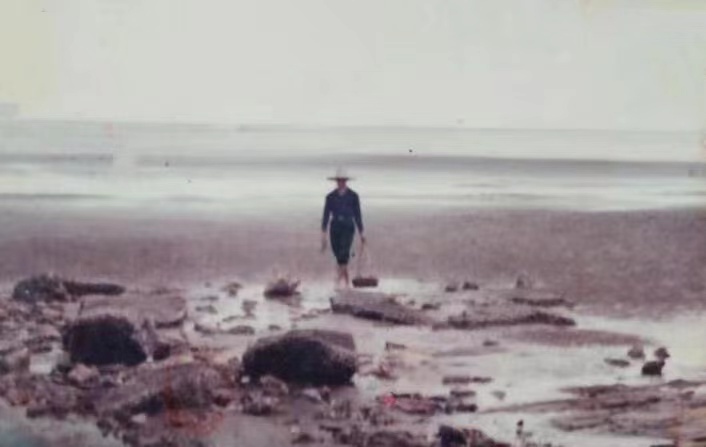 20世纪90年代初,刘永泉的父亲在海边沙滩挖沙虫的身影。