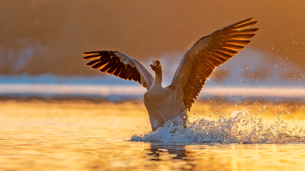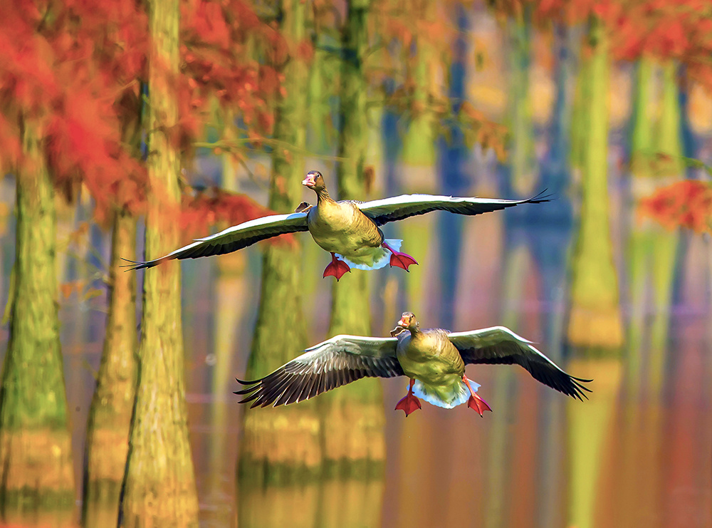 灰雁一般选择成群活动,群通常由几十上百,甚至上千只组成,尤其是迁徙期间。成群的灰雁在行进时会排成“人”字形或“一”字形的雁阵,这是为了进行长途迁徙而采取的有效措施。当飞在最前面的头雁扇动翅膀在空中划过时,翅膀尖上就会产生一股微弱的上升气流,排在它后面的灰雁就可以依次借助这股气流飞行,从而节省了体力,也加速了整体的飞行速度,这就是我们通常所说的“雁阵效应”。雁阵效应不仅体现了灰雁超强的团队协作能力,也是一代代灰雁在迁徙活动中积累的智慧结晶。