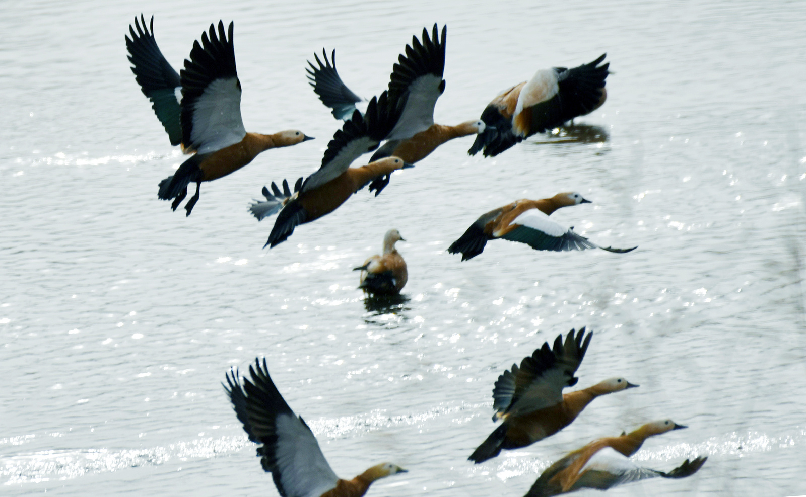 河北省张家口市宣化区洋河上空赤麻鸭成群飞舞。陈晓东 摄