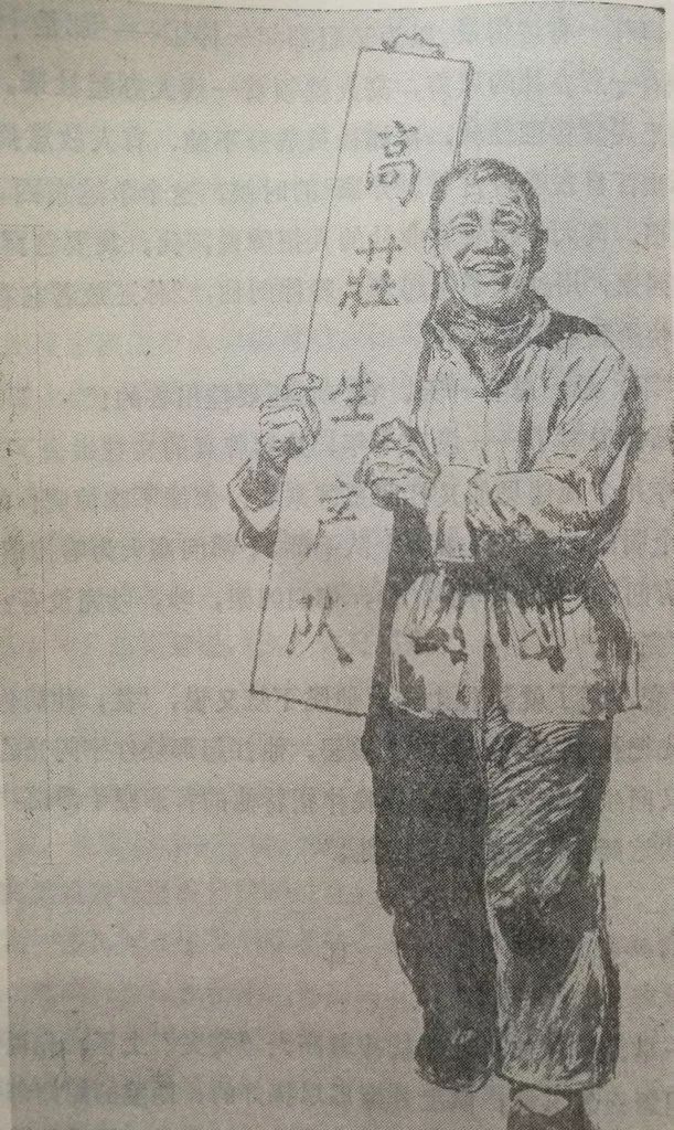有一回,闺女生了个胖小子,高大乐得一夜没有睡好。天一明,他就一骨碌爬起来,要到闺女家去瞧瞧。可是他那两条腿就象认熟道一样,三迈两迈又迈到队部去了。一进门,两个干部正吵得脸红脖子粗。高大劝劝这个劝不下,说说那个也不听,一跺脚扭头走了。走出门,他一眼瞅见挂在门口上的那块红字大招牌,赌气摘下来扛回家去。一进家,晚伴吃惊地问道:“呀!你怎么又扛了它来啦?”