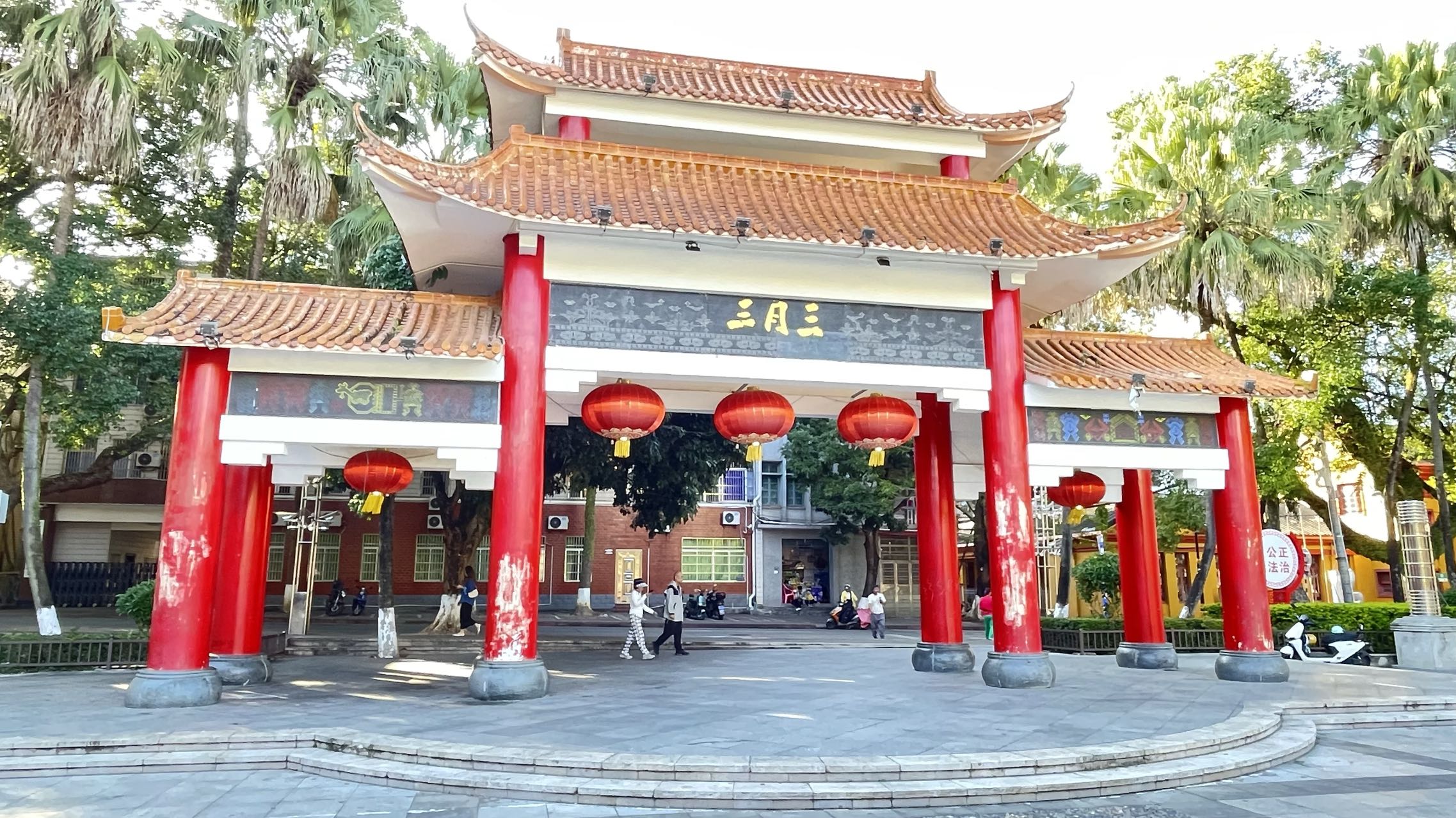 按约定,下午4:00,我准时到达炜的小区门口,他们夫妇已站在路边等候。上车,炜指挥我左转右转,几分钟后我们到达市委市政府对面的“三月三”广场。广场面积只有1000多平方米,是当地群众休闲娱乐集会的场所,是五指山市“三月三”年会举办地。这里,有红柱黄瓦筑成,门楣题“三月三”金黄大字的牌楼;有颇具黎苗民族特征,雕有多种图腾的高大石柱;有红黄相间,高处只有两层的省级文物保护单位,“海南黎族苗族自治州人民政府办公楼旧址”。我本打算好好看看“旧址”,却被一把大锁拒之门外,只得拍照记录到此一游。