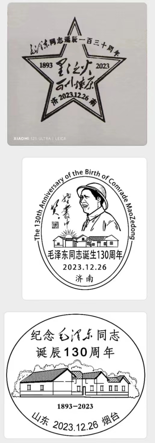 2023年12月26日,是毛泽东同志诞辰130周年纪念日,多种形式的纪念活动层出不穷。据悉,今天早上,在朋友圈里,见到了三枚纪念毛泽东诞辰130周年纪念戳,其中间一枚为著名邮品设计大师任怀平先生参与设计。