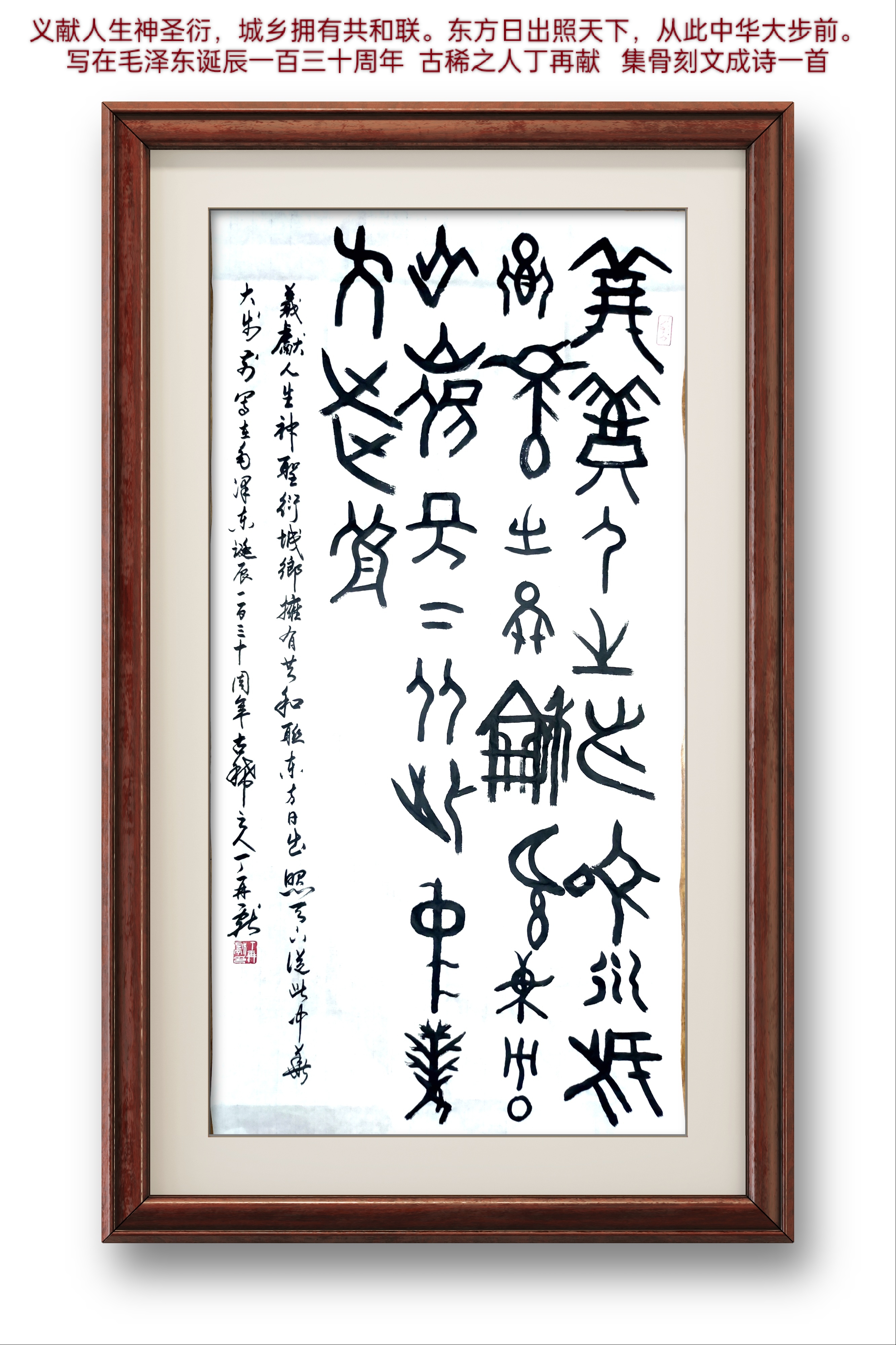 大家读后纷纷发表了对毛泽东的敬仰之情,并对任怀平等先生的设计大加赞美。著名学者、一级书法家、东夷骨刻文字系统破译者、骨刻文书法艺术创始人丁再献先生也不例外,丁先生遂集东夷骨刻文字成诗一首,以作纪念,诗曰: