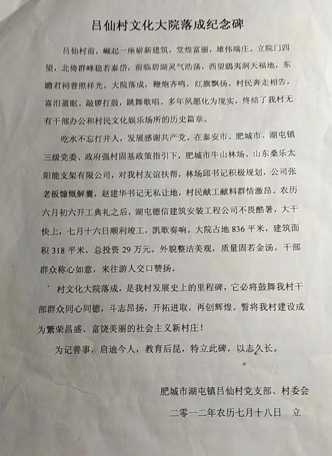 村文化大院落成,是我村发展史上的里程碑,它必将鼓舞我村干部群众同心同德,斗志昂扬,开拓进取,再创辉煌。誓将我村建设成为繁荣昌盛,富饶美丽的社会主义新村庄!