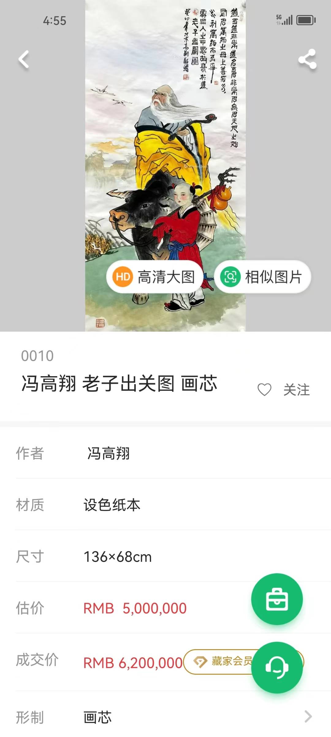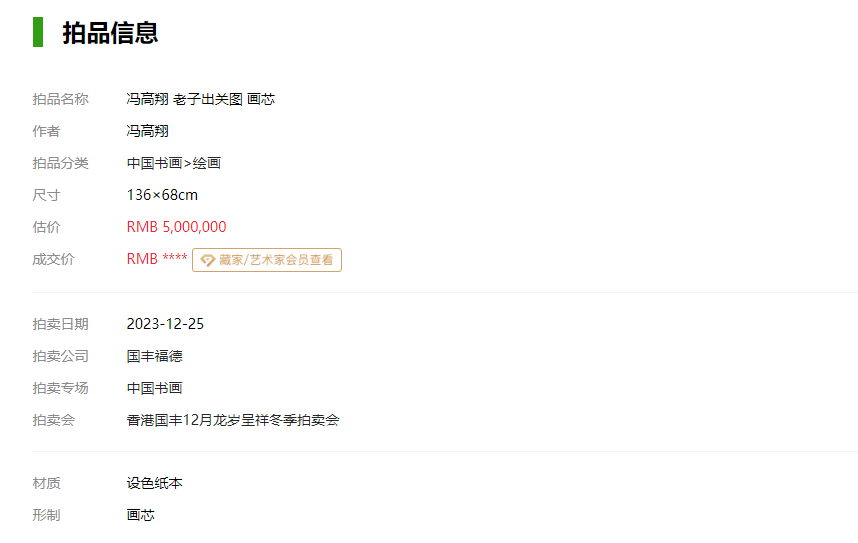 2023年12月25日,龙岁呈祥冬季拍卖会,由香港国丰福德拍卖有限公司拍卖大红袍艺术家冯高翔《老子出关图》设色纸本,画芯,规格:136x68cm;以陆佰贰拾万元(6200000)人民币落槌成交!