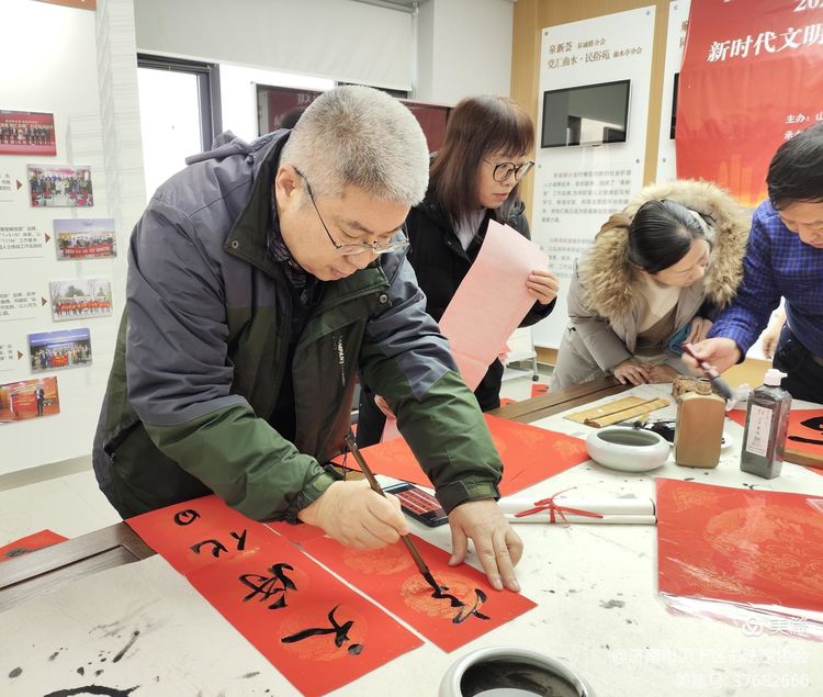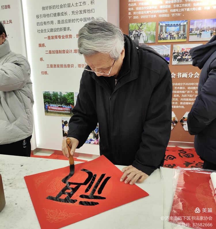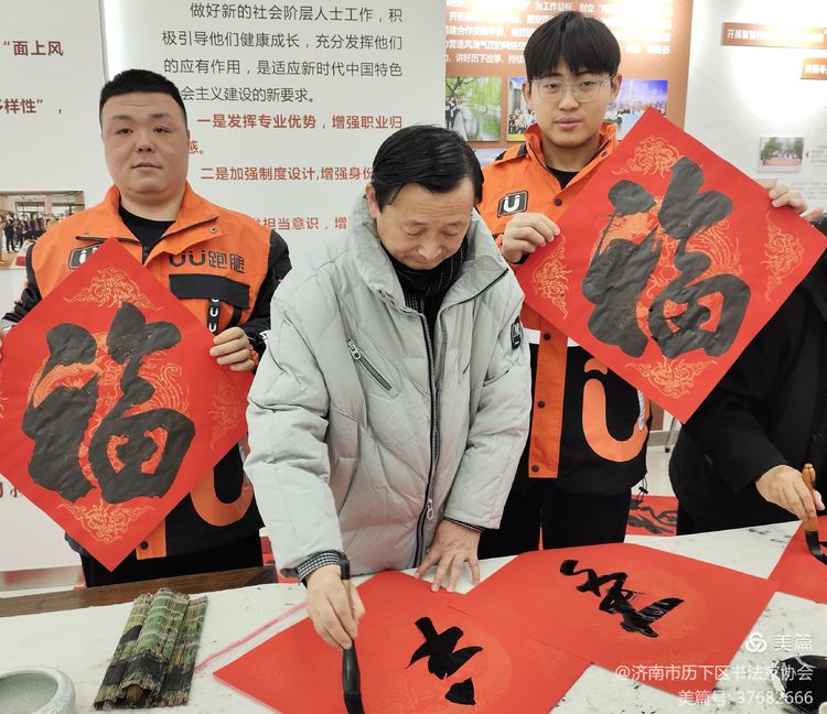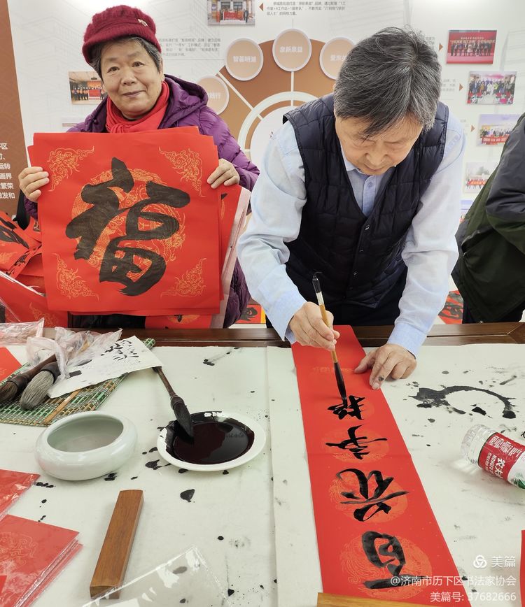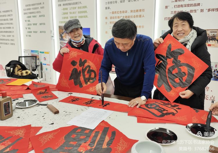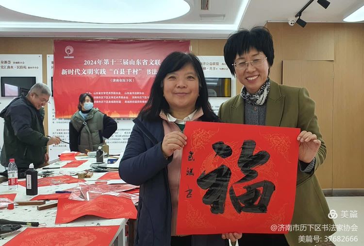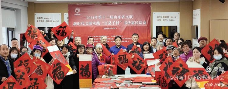 书“福”送“福”活动。现场气氛热烈,书法家挥毫泼墨,激情满怀,把一幅幅蘸满墨的“福”字,吉祥如意的“对联”送到社区百姓手中,短短一个半小时的时间,为社区居书写各种形式的“福”字和对联。居民手捧着一个个“福”字,喜上眉梢。高兴的合不拢嘴。山东省“百县千村”志愿活动已已经有13年之久,历下区书协同步进行,同频共振。