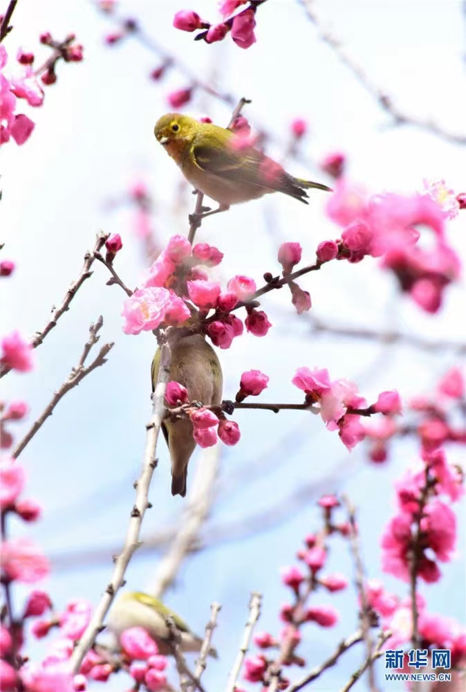 红颜朵朵朝天笑,梨蕊翩翩绕树飞。