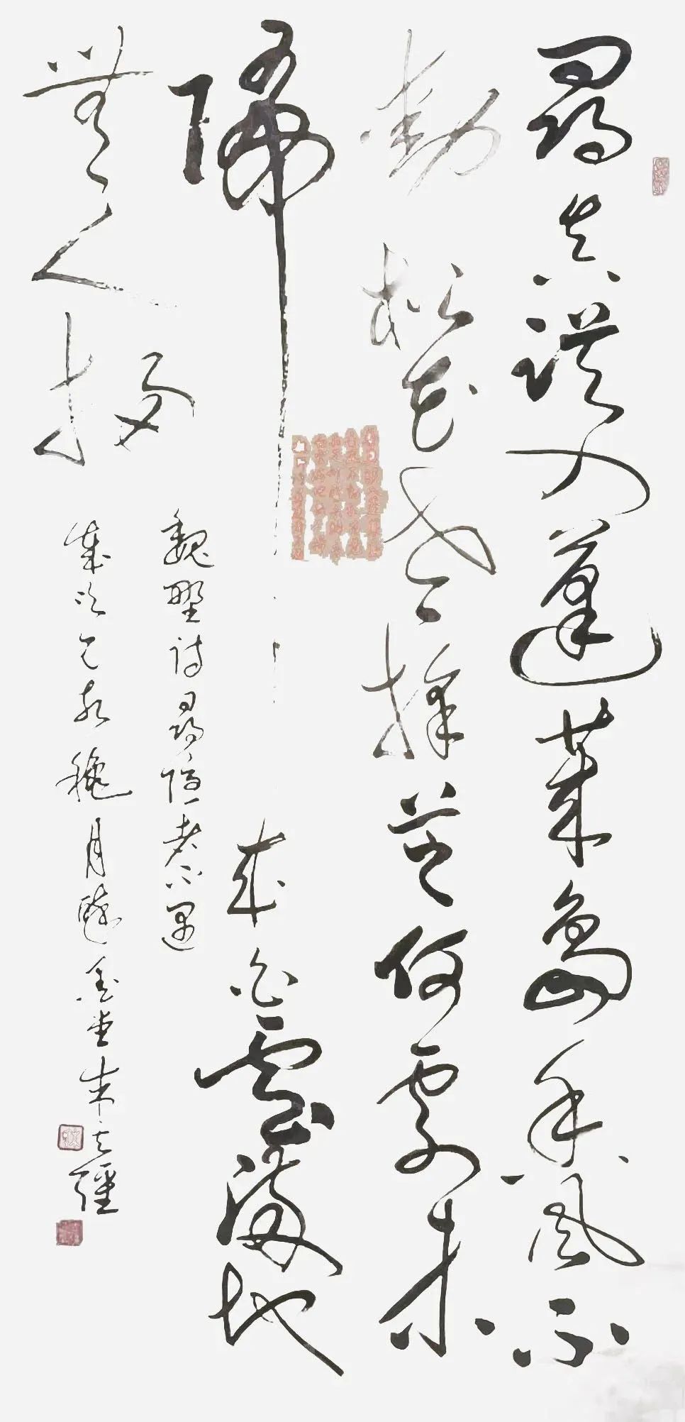 时有张旭草书的妙于肥,可见古诗四帖的丰姿多神。时有怀素草书的妙干瘦,可见自叙帖的铁画银钩。亦有师法当代草书大家的进取成果,有刘洪彪、周剑初书法气势磅磷的空间塑造品质。所以他的草书通过师古亦师今的精彩表现,获得了草书线条的无限动感,也赢得了草书作品结构空间的正大气象,让草书从平面艺术迈进空间艺术的塑造新路径。现代主义的表现与古典主义的加持,使朱立强先生的书法作品成为鉴古开今的典范!
