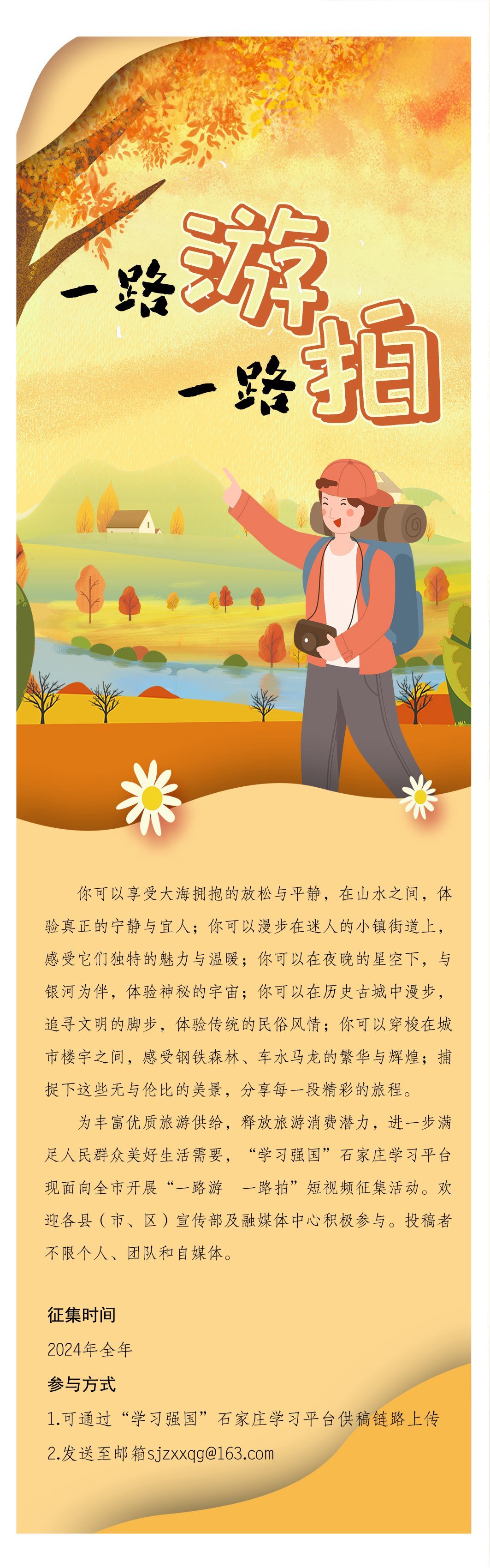 可通过“学习强国”石家庄学习平台供稿链路上传,也可发送至邮箱sjzxxqg@163.com。供稿时要求带有“一路游 一路拍”栏头,并选择“一路游 一路拍”话题。
