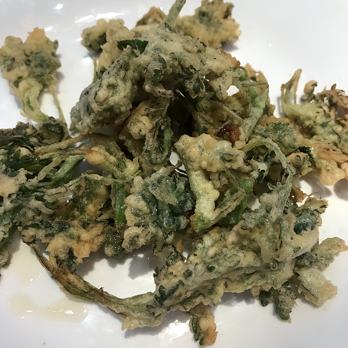 这看似简单的操作,真正拿捏好,其实也不容易,记忆中,父亲炸的不是火候不到,就是炸过了,没少挨母亲的数落。这炸“菊花芽”,除了取新鲜的“菊花芽”外,这面糊的稀稠、挂糊的多少也很重要,糊稠了,尝不到“菊花芽”的鲜香,跟吃炸面鱼没有两样;糊稀了,稍不注意,那芽就炸焦、炸糊了。除此之外,炸“菊花芽”最关键的就是要控制油温,一般以五成热最佳,这样炸出的“菊花芽”,既保留了“菊花芽”嫩绿的色泽和原味的清香,同时,又增加了咸、酥、脆的味道,吃起来清香扑鼻,酥脆可口。