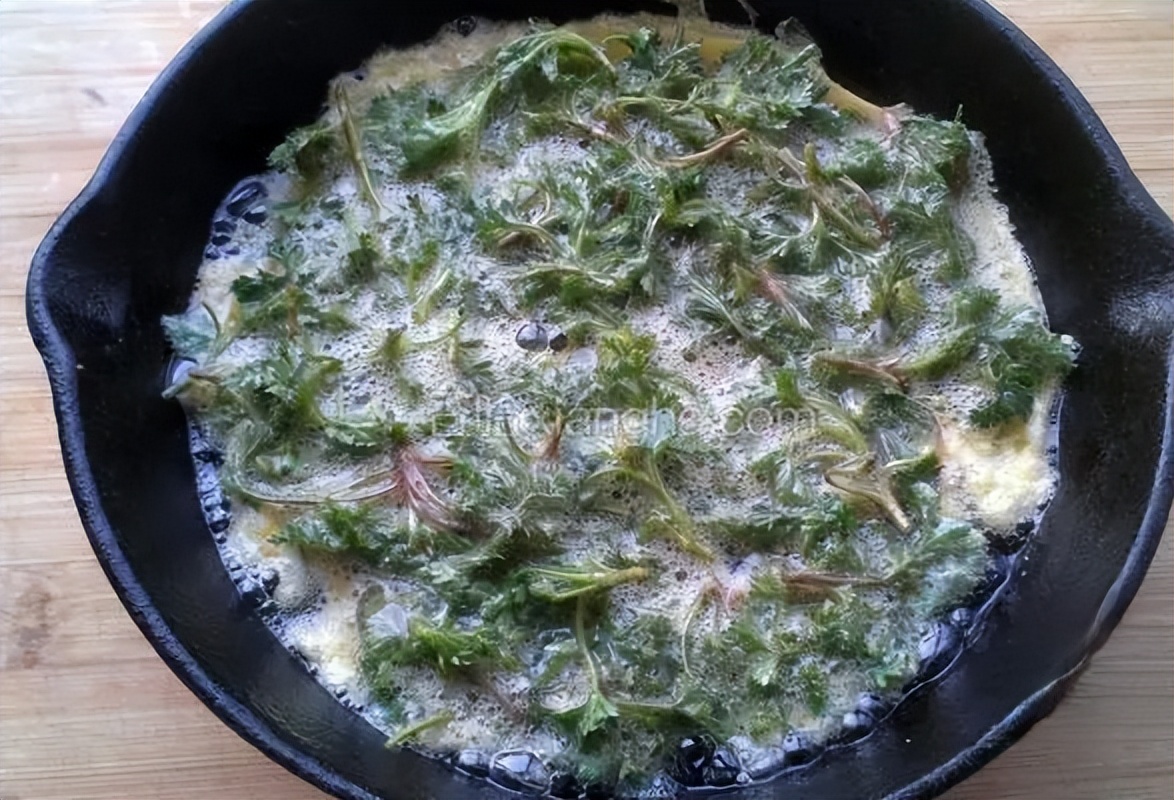 这“菊花芽”,除了凉拌、炸着吃外,还有一种煎着吃的吃法。春天万物复苏,草木葱茏之际,故乡的“菊花芽”一簇簇、一片片,满山遍野,随处可见。此时,乡亲们常常把采来的“菊花芽”与面、鸡蛋混在一起,像煎槐花饼、白蒿饼一样煎着吃,色香味也是十分诱人的。