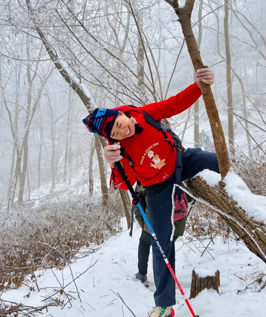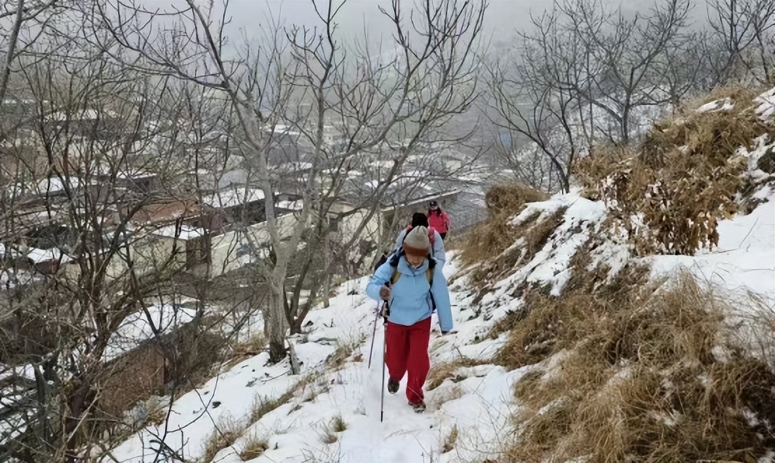 山坡上满是白皑皑的积雪,我猜这可能是前几天刚下的那场大雪尚未融化吧。虽然过去了几天,但由于山区气温低,难以融化很正常。大家踏着积雪上山,听着脚底下冰雪发出的“咯吱、咯吱”的歌唱,也倒开心。山坡不甚陡峭,尚未爬上半山,可能大家还有点不大适应,便自动地停下来稍稍歇息。回望山下,淡雾之中,村舍俨然,鸡犬声闻,一幅雪后山村的美丽图景令人心动。