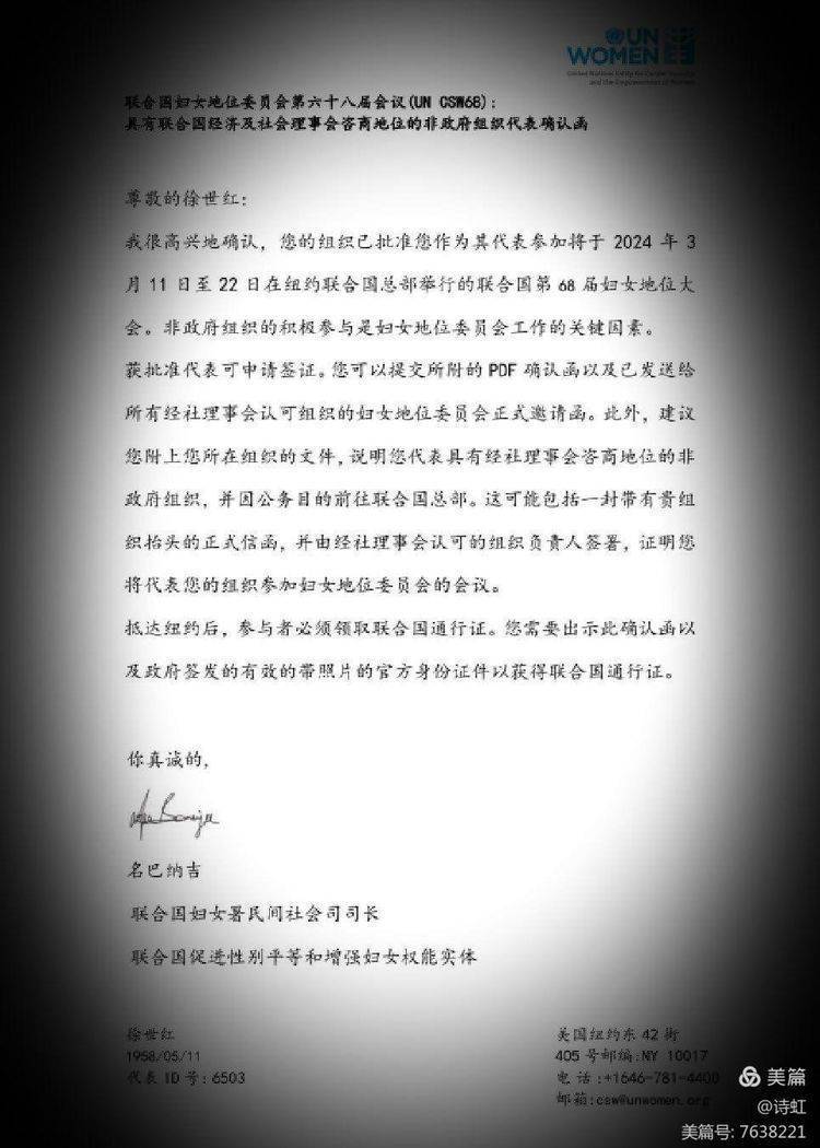 今年3月10日,诗虹作为中国女艺术家,被相关公益组织推荐,受联合国妇女地位委员会邀请将赴纽约联合国总部参加联合国第68届妇女地位大会及纽约非政府组织妇女地位委员会论坛,并在相关会议上发表演讲。向世界展示中国女性风采及艺术家魅力。