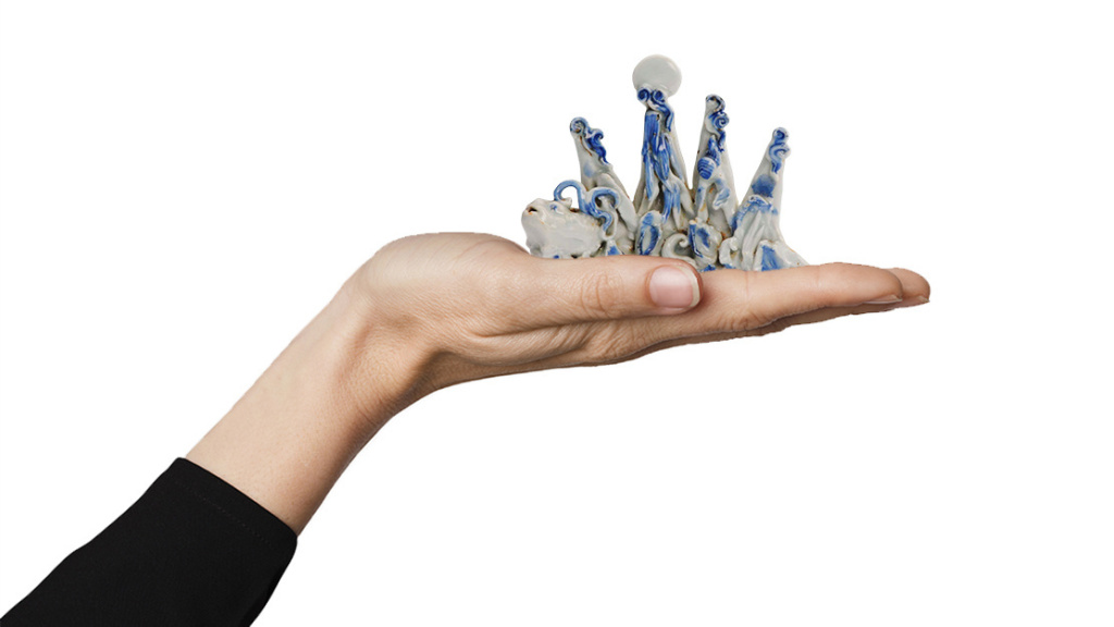 青花描绘出峰峦、云朵、波浪和海礁石