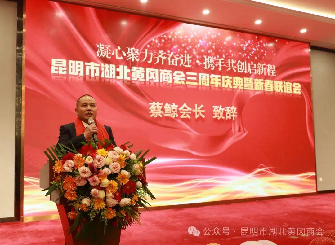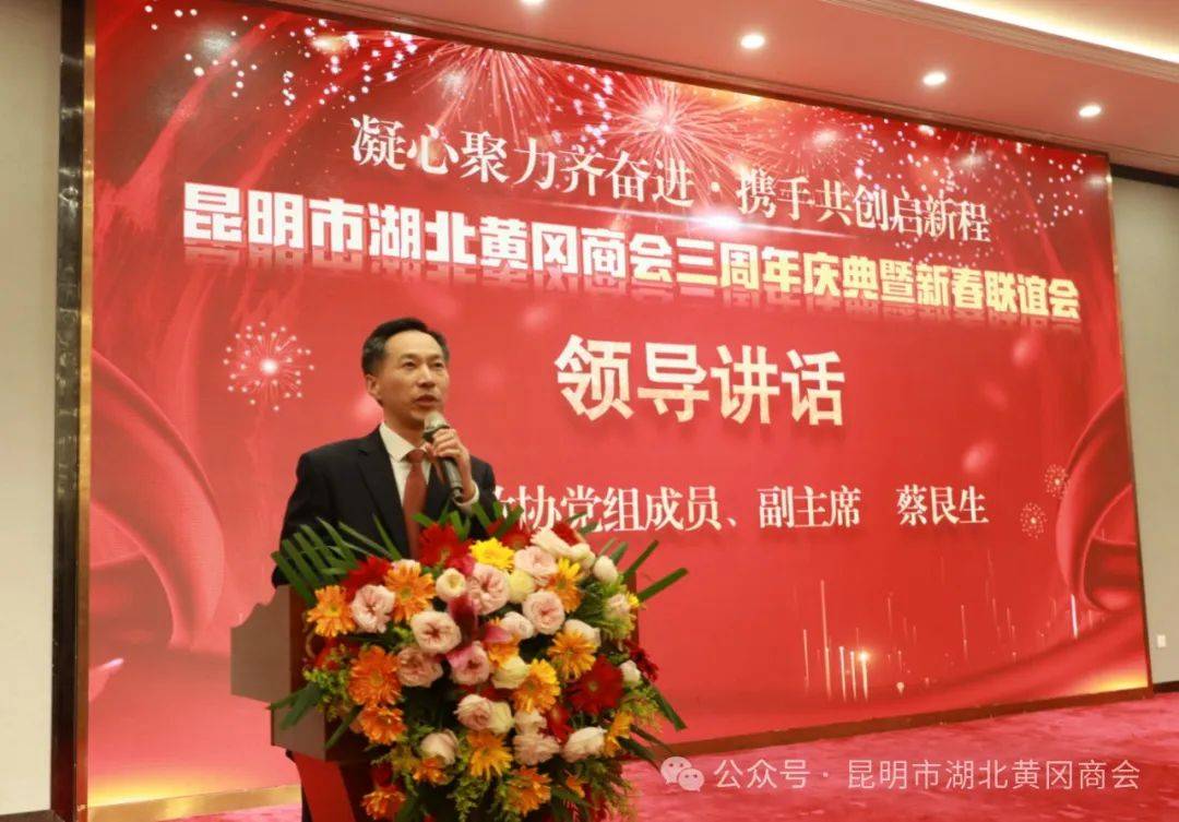 黄冈市政协党组成员、副主席蔡艮生发表讲话。他首先代表中共黄冈市委、黄冈市人民政府,向一直以来关心支持在滇黄冈楚商的昆明政府表示衷心的感谢,向各位与会代表表示热烈的欢迎,对本次三周年庆典大会的如期举办表示热烈的祝贺!